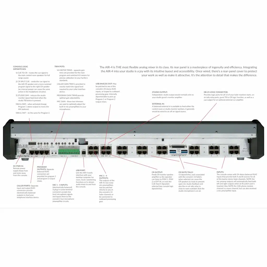 The Audioarts AIR-4 12-channel radio console is the perfect blend of compact design and professional performance, delivering everything you need in a radio console without compromise. Built on the simple premise that low cost doesn’t have to mean low quality, the AIR-4 offers a host of advanced features at an affordable price. It includes four built-in microphone preamps, eliminating the need for external preamps and allowing you to connect a host mic and three guest mics directly. With 12 input faders (with A-B source select), a 13th fader for call-ins, external machine control, two program busses, and built-in cue, CR, and headphone monitoring, it’s a complete solution for a variety of broadcasting needs. The AIR-4 also features patchable USB connectivity for integration with PC-based news, production, and streaming systems, making it ideal for local radio stations, internet broadcasters, and smaller production facilities. Designed with top-quality components, the AIR-4 delivers superb performance while maintaining ease of use with essential features like machine control, cue, talkback, and mix-minus. Perfect for stations looking to upgrade or larger facilities in need of a secondary studio or newsroom console, the Audioarts AIR-4 is built to last. Drawing on Wheatstone Corporation’s expertise in designing and manufacturing audio consoles in New Bern, NC, USA, the AIR-4 ensures unparalleled quality, performance, and reliability. It’s an excellent choice for broadcasters who want superb sound and a feature-rich console at an unbeatable value.