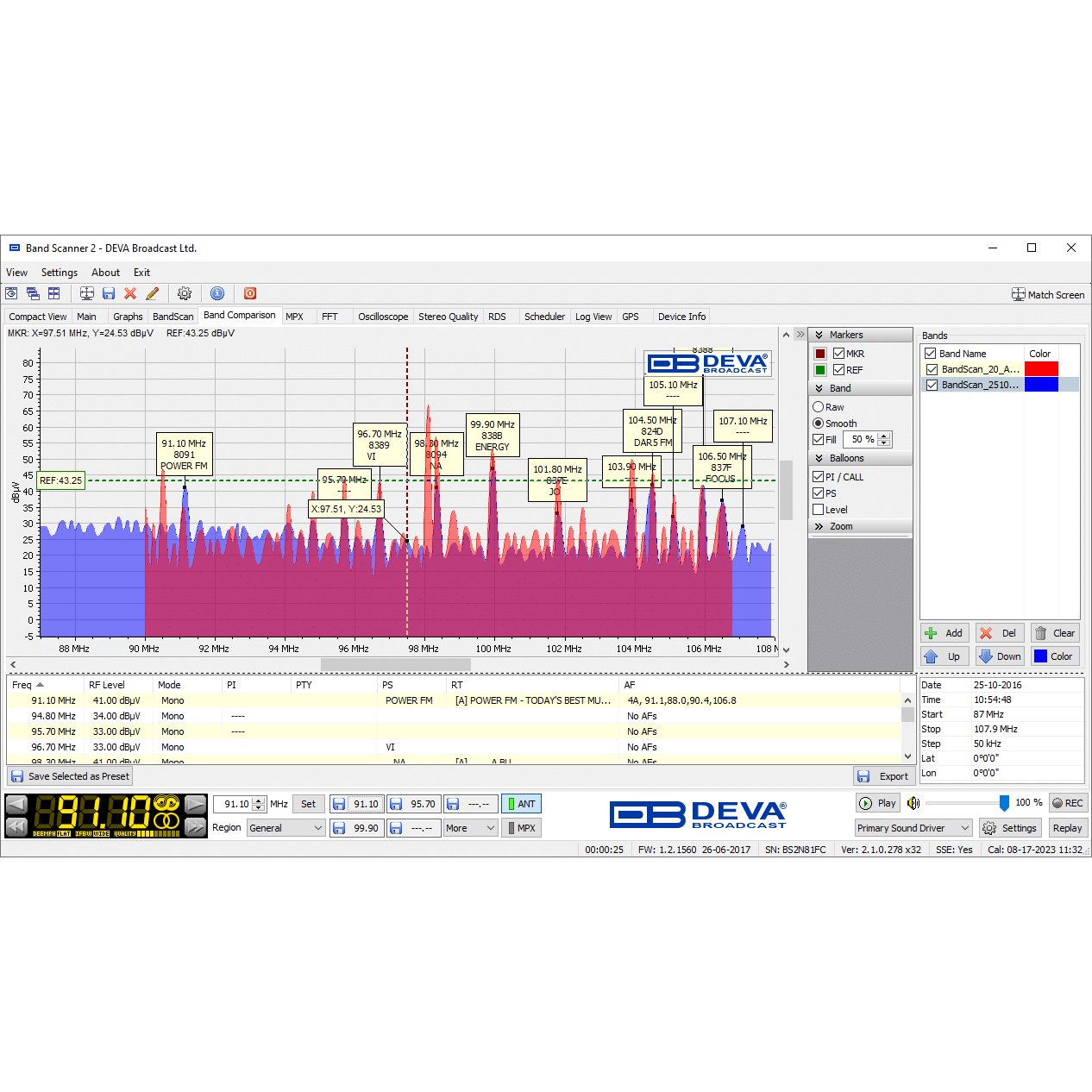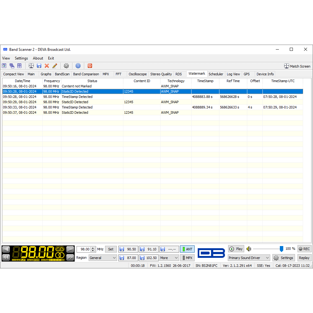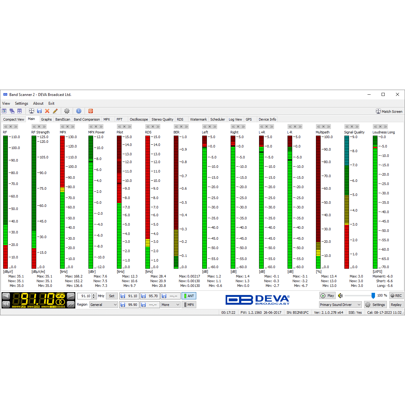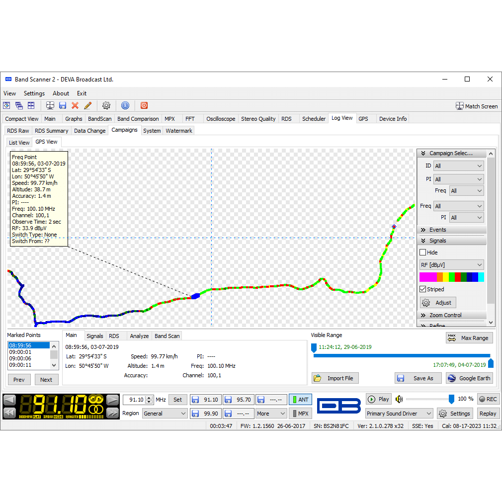 The Band Scanner 2 is a groundbreaking device that enhances the capabilities of its renowned predecessor, offering the ultimate tool for assessing FM broadcast band congestion and logging station identification parameters. True to the legacy of the original Band Scanner, this advanced tool measures RF level, MPX deviation, Left & Right Audio Levels, RDS, and Pilot injection levels. During a survey, the measurements are stored in a log file, which can then be easily converted into KMZ format for visualisation in Google Earth.