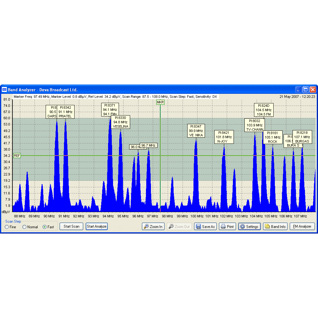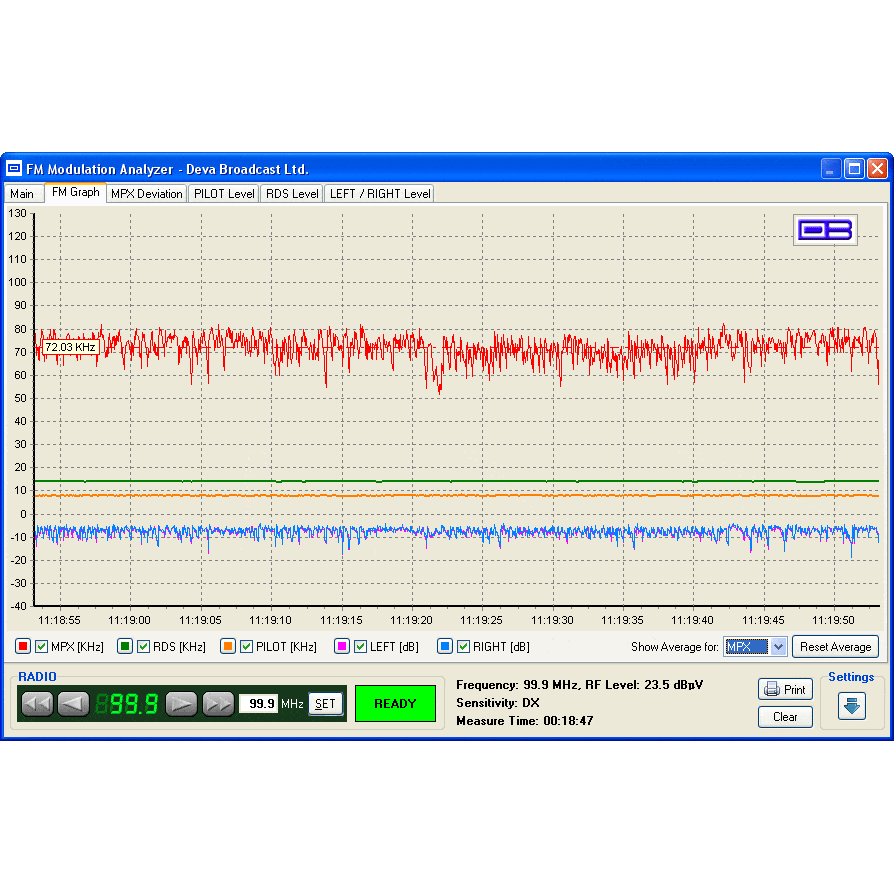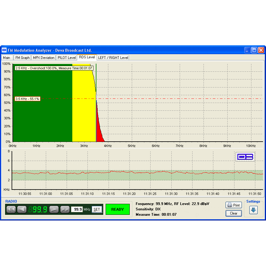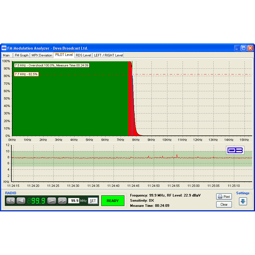 Perfect for fieldwork, the pocket-sized device measures RF level, MPX deviation, left and right audio levels, RDS, and pilot injection levels. Its frequency range spans from 87 to 108 MHz. The included free Windows software scans the FM band, logging each carrier and generating a spectrum display of carrier level versus frequency, while also analysing and compiling a station list.