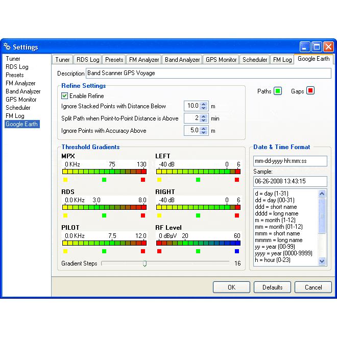 The Band Scanner GPS is a compact, USB-powered tool designed for evaluating FM broadcast band congestion and logging station identification parameters. With a built-in GPS receiver, it offers Google Earth compatibility, allowing for easy visualization of collected FM radio data. The log file can be exported as a .kmz or other transitional format for future analysis.