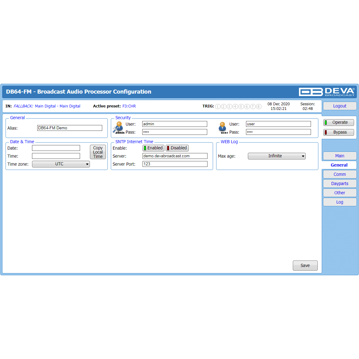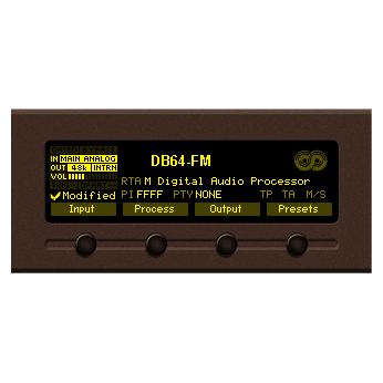 Ideal for LPFMs, the DB64-FM features a 4-band processor with Fidelity and Sound Impact Systems, ensuring uncompromised sound quality. It also includes a range of advanced features, such as an FM-controlled distortion limiter, analogue and digital audio outputs, two independent composite MPX outputs, and the ability to detect signal loss and switch to a backup source. The device also sends automatic notifications via email or SNMP for input or present changes.