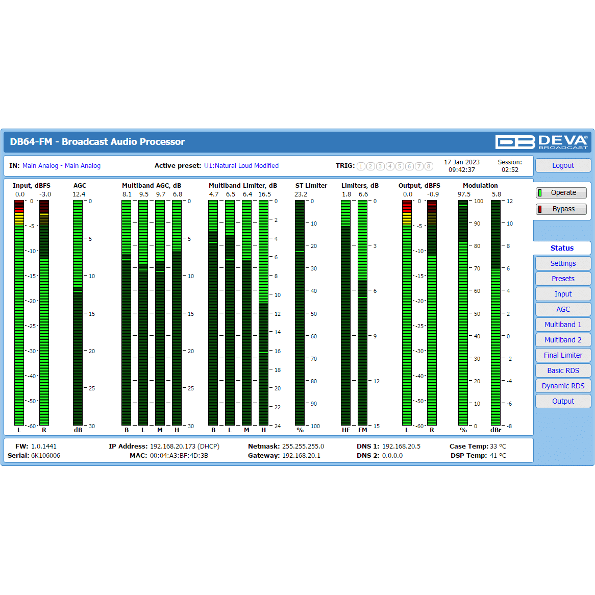 The DB64-FM is DEVA’s premier audio processing solution, offering an unparalleled balance of quality and affordability. Designed to deliver flawless sound clarity, it boasts a wide range of features that set it apart from others in its class. As with other members of DEVA’s audio processor family, this device combines reliability and functionality in a remarkable way. Its all-digital DSP-based architecture, 4-band processor, and advanced wideband AGC are just a few of the key components that ensure outstanding performance.