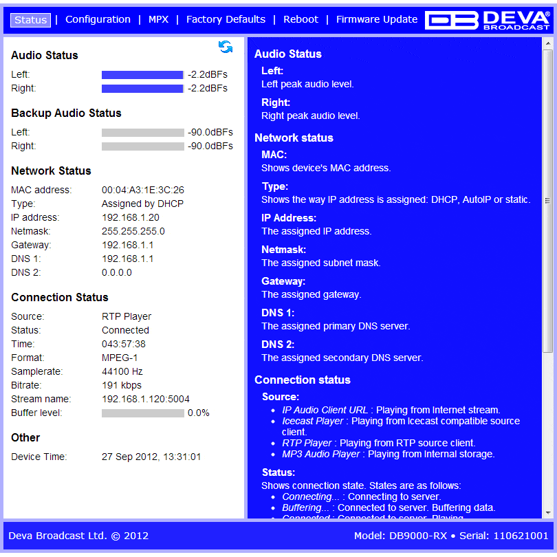 When paired with the optional Stereo and RDS Encoders, the DB9000-RX becomes a comprehensive solution for audio rebroadcasting. The stereo encoder generates a fully digital composite MPX signal with high-quality stereo output. Additionally, the RS-232 port allows the DB9000-RX to function as an Ethernet-to-RS-232 redirector, enabling remote control of other equipment over the Internet. The device can also be managed via any web browser for ease of use.